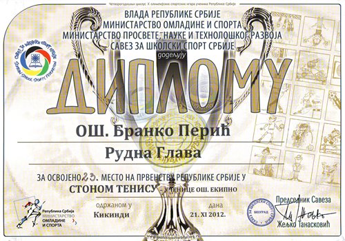 Републичко екипно такмичење у стоном тенису за ученике основних школа одржано је 21.11.2012. године у Кикинди. На овом такмичењу учествовали су и ученици наше школе.