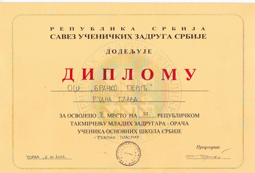 Како ранијих година тако и ове године ученици наше школе учествовали су на републичком такмичењу младих задругара - орача. Такмичење је одржано 6.10.2012. године и наш тим освојио је треће место.